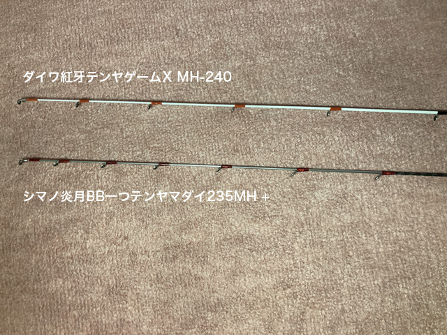 ティップはシマノ炎月BB一つテンヤマダイ235MH +がシルバー、ダイワ紅牙テンヤゲームX240-MHが白です。