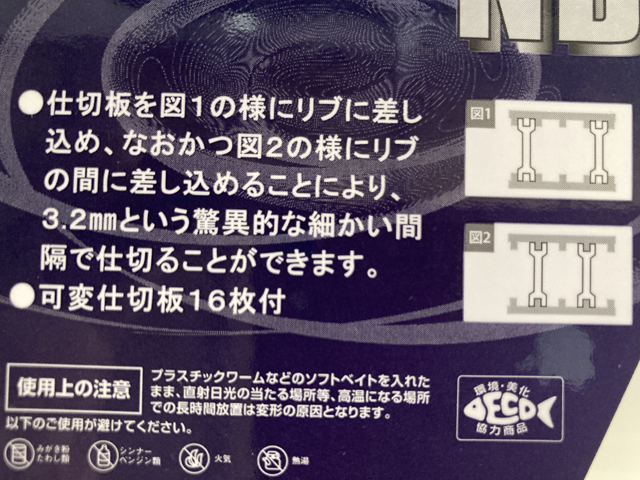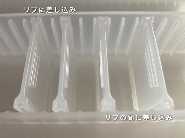 VS-3020NDの特徴が仕切り板をリブに差し込む、リブとリブの間に差し込むかで間隔を調整できます。最小3.2mmの間隔で仕切る事が出来ます。