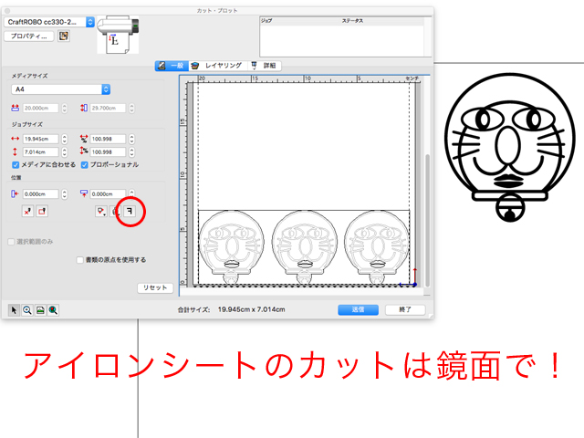 イラレで描いたカッティングデータをカッティングマシンに送信。アイロンシートをカットする際はデザインを鏡面にします。