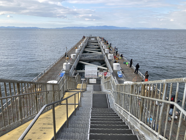 とっとパーク小島はこんな感じで桟橋が沖に向かって延びていて、左側が和歌山、右側が大阪になります。